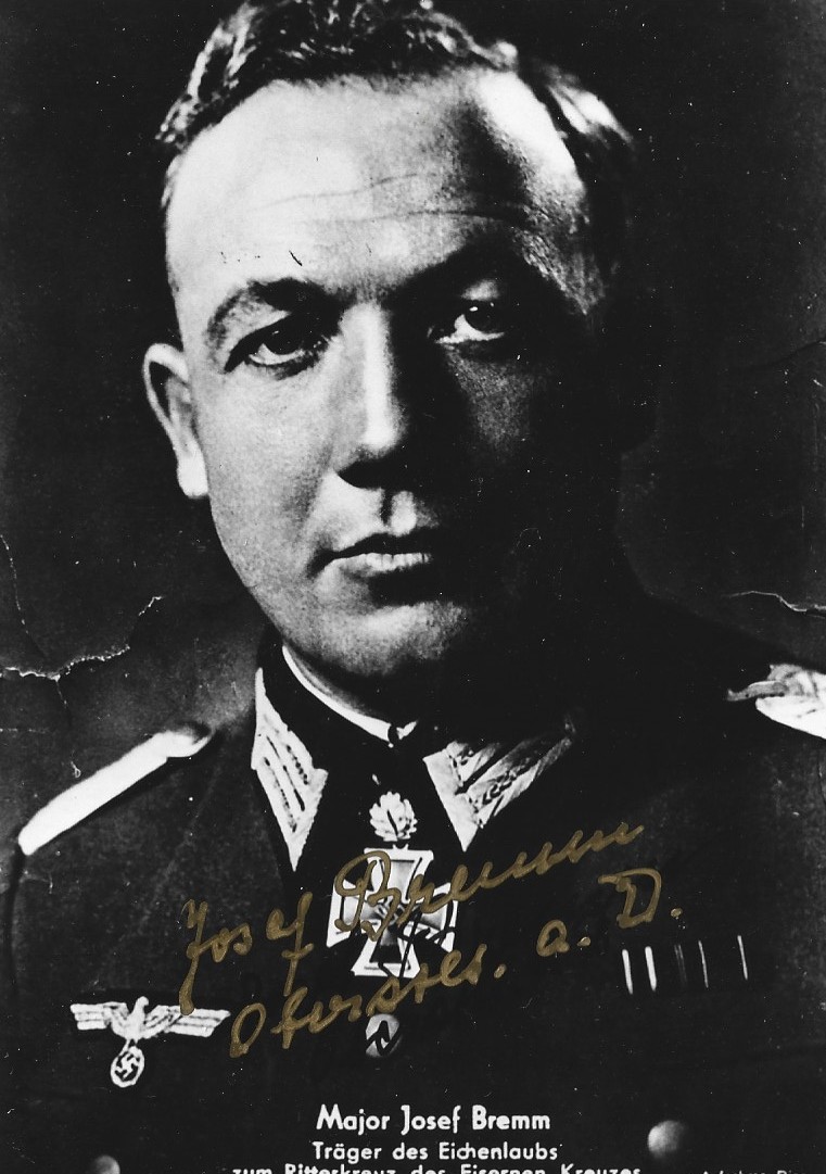 “Oberleutnant Josef Bremm already received the Knight’s Cross on the 18.02.1942 as a Leutnant. With this award he was rightfully recognized for his outstanding bravery during the hard defensive combat in the winter of 1941/42. He would go on to repeatedly distinguish himself as a particularly brave and energetic officer during the heavy combat southeast of Lake Ilmen. At the end of September, while leading at the head of an assault troop, he penetrated into an enemy blocking position with the full element of surprise and rolled it up in a bold follow-up action. It was solely thanks to this action that his attacking Regiment was able to reach its ordered day’s objective. A few days later he and his subordinated Bataillon shielded the Division’s flank all by themselves against the oncoming Bolsheviks. In the process he was wounded for the fourth time, however he did not give up his command until all the enemy attacks had been broken.”