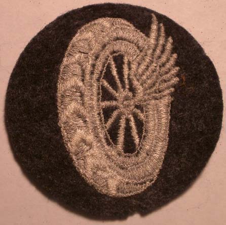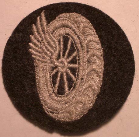 The badge is roughly, 2 1/4" diameter, dark, mottled, Luftwaffe blue/grey wool base with a machine embroidered, seven spoked wheel rim and tire with an upward swept wing emanating from the central hub all in silvery/grey threads. The badge has a moth nip at the bottom of the tire,otherwise in good condition